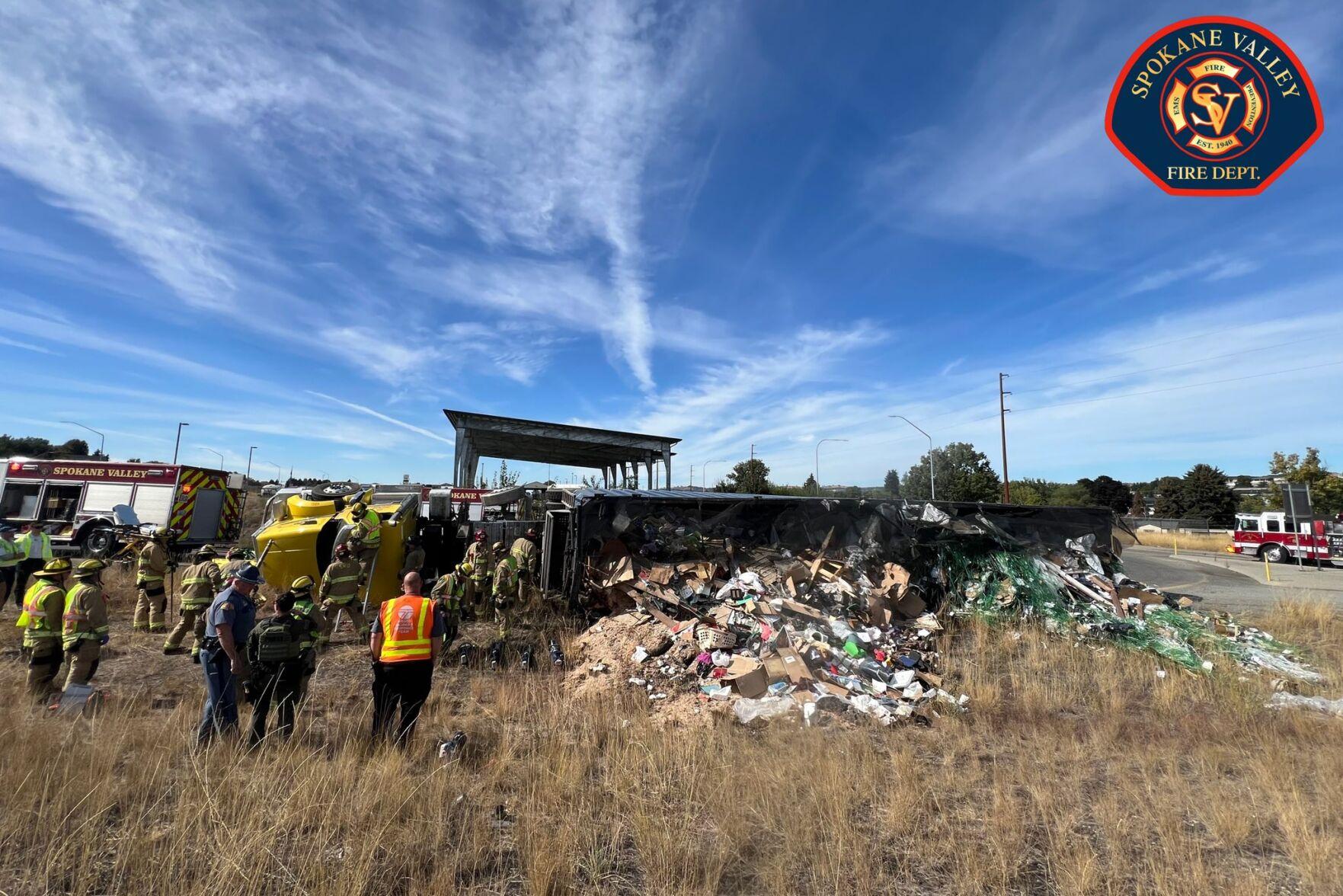According to Spokane Valley Fire Department, rescue crews are currently working to stabilize the truck before they can free the trapped driver.