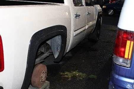 When officers arrived, they saw a white truck in the lot with its tires missing.