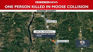 STEVENS COUNTY, Wash. — A driver was killed when he hit a moose in the road north of Chewelah Monday.