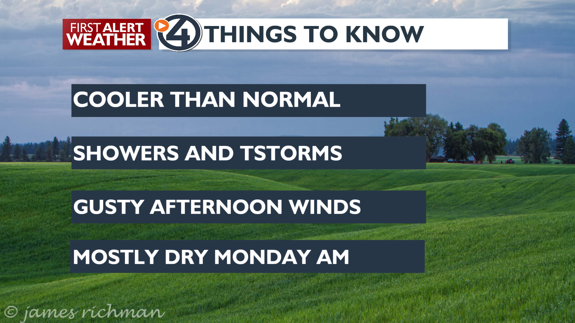 Strong to severe thunderstorms in Southeast Washington and the Southern Idaho panhandle Periodic showers and potential storms Sunday nightCooler than normal temperatures next week