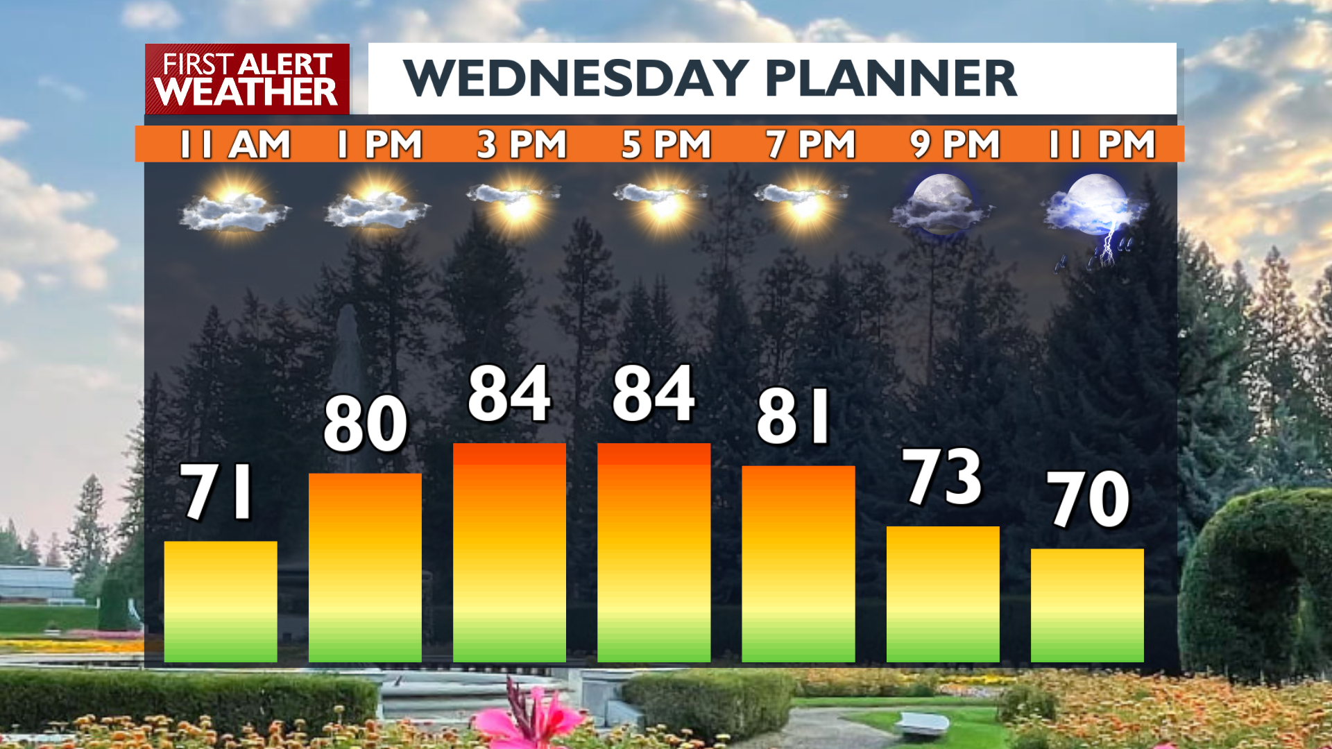 A weather system tracking inland will keep thunderstorm chances elevated in eastern Washington and the Idaho Panhandle. Wednesday, however, will be a break from wet weather chances for most of us with hazy skies from local fires.