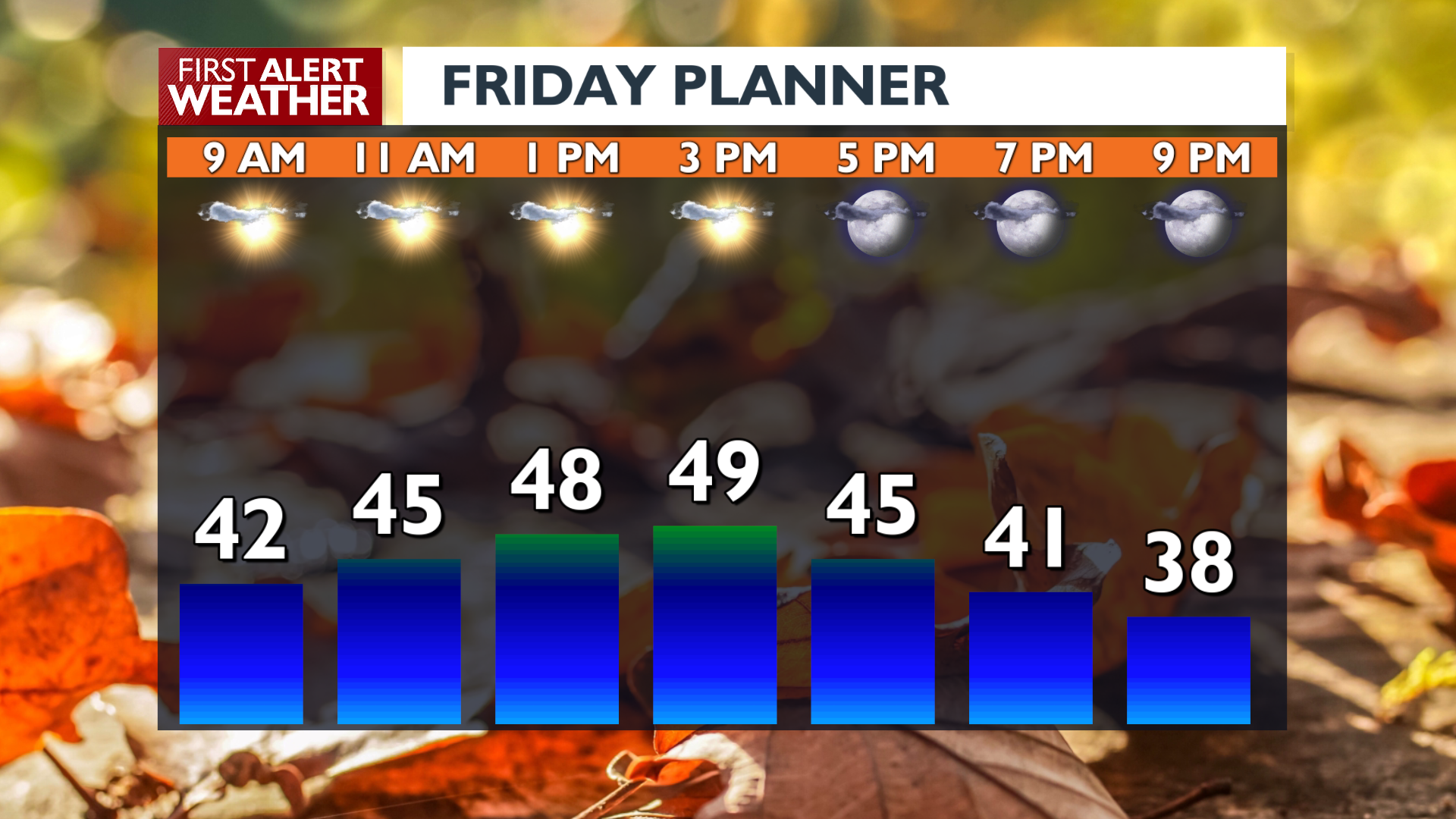 With wet weather done with for the time being, we’re set up for a nice, but blustery Friday. Expect breezy conditions all day with gusts from 30 and 45 mph at times. Winds will calm down by the evening. That will allow temperatures to drop quickly into the 30s before you go to bed Friday night.