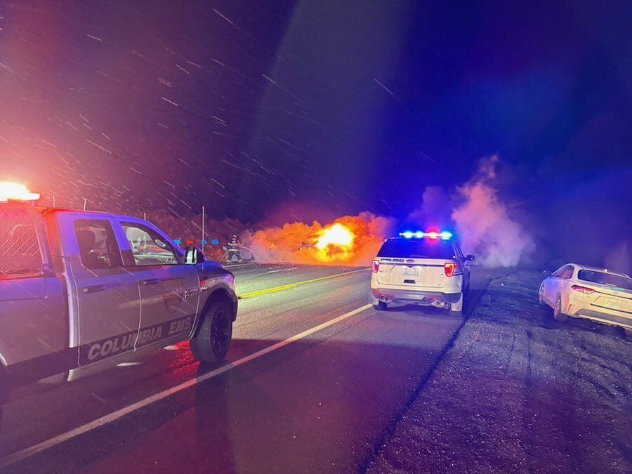 According to WSP, three vehicles crashed on the highway about six miles west of Quincy. At least one vehicle caught fire.