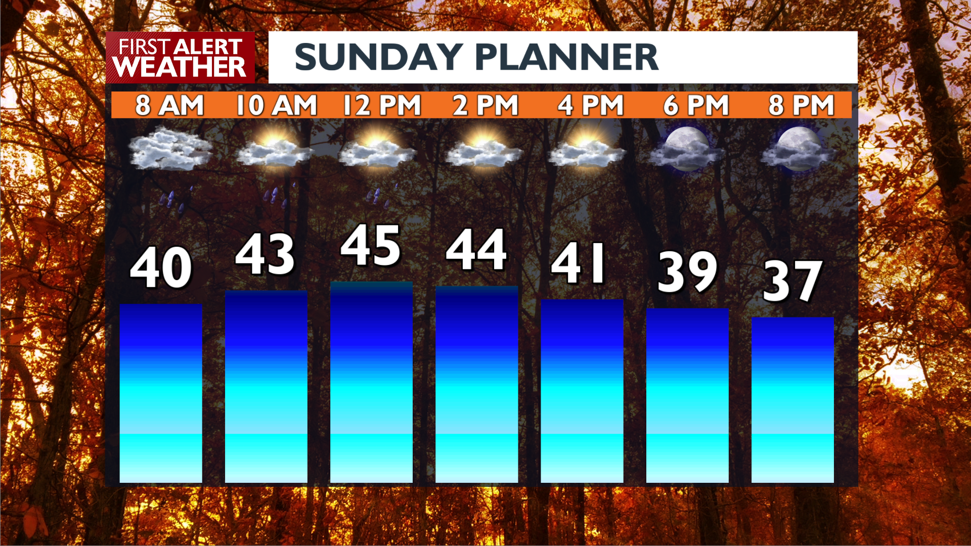 The day will begin with rain showers across the area, tapering off by late morning. Expect some sunbreaks in the afternoon, though late scattered showers are still possible. Highs will remain about 10 degrees above average, reaching the mid-40s.