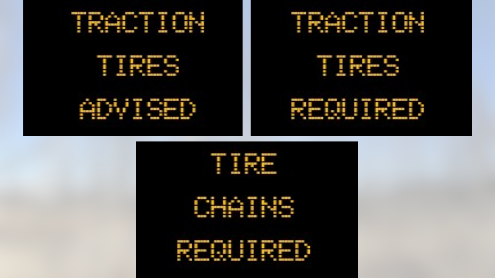 Passenger vehicles (including all-wheel and four-wheel drive):Traction tires are suggested but not required.Large vehicles (trucks, delivery vehicles, semi-trucks):Traction tires are required. If the vehicle doesn’t have them, drivers must put on chains or an approved alternative. Chains or an approved alternative must be kept in the vehicle in case conditions get worse.Oversize loads:Oversize loads are not allowed on these roads. Normally, these loads need special permits, but no permits are issued when traction tire or chain advisories are in effect.