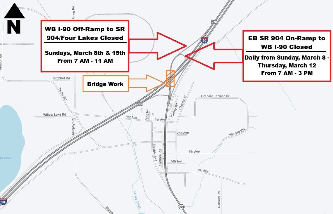 SPOKANE COUNTY, Wash. — Drivers who use the westbound I-90 on- and off-ramps at the Four Lakes interchange will have to plan a different route.